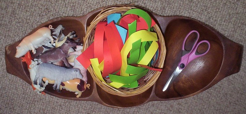 My toddlers love this activity. They focussed for an incredibly long time, cutting the streamers into food for the animals to eat. (The scissors should be presented on the tray with the blades facing away from the child.)